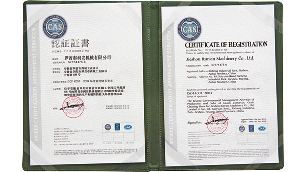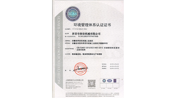 公司已通過了ISO9001質(zhì)量管理認(rèn)證、ISO14001環(huán)境管理體系認(rèn)證和ISO45001職業(yè)健康安全管理體系認(rèn)證。為中國(guó)儲(chǔ)備糧管理總公司糧機(jī)設(shè)備的A級(jí)供應(yīng)商、安徽省高新技術(shù)企業(yè)、擁有阜陽(yáng)市企業(yè)技術(shù)中心。